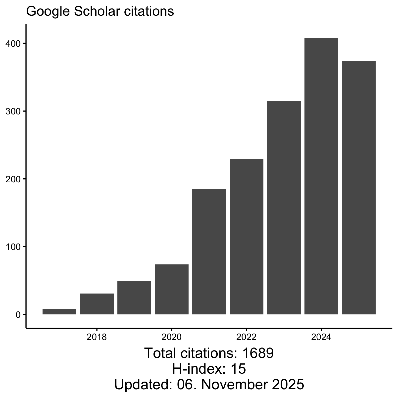 My research primarily explores migration and conflict, with a focus on public attitudes and political communication. My work has received wide recognition, with over 1,500 citations on Google Scholar (see plot on the right), ranking in the top 5% for citations according to Web of Science and in the top 2% compared to peers with similar academic age on ResearchGate. Moreover, most of my papers are in Altmetric’s top 5% of all research outputs and among Scopus’ top 25% most cited articles globally. These findings were featured in national and international media and influenced global and EU-level policy institutions.